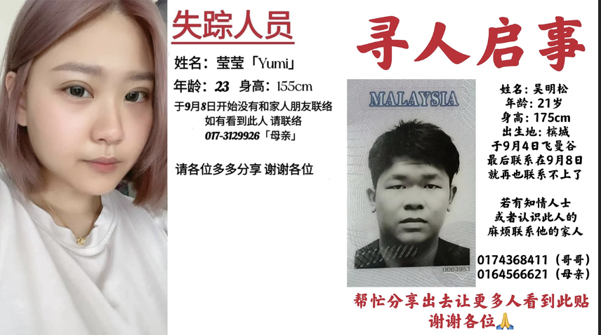 槟城一名23岁华裔女子伍莹莹,被指与男友赴泰国旅游后下落不明至今,家人对其安全感焦虑,而男友家人也发布寻人启示,促大众协助寻找同样失联的吴明松。