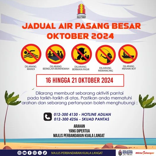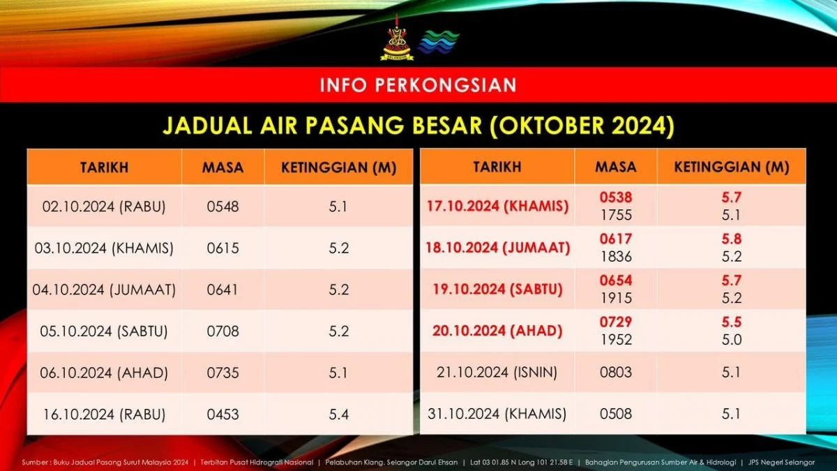 雪州水利灌溉局在脸书通报10月的大海潮时间表,首波涨潮是在2日起至6日来袭,平均最高海潮水位为5.1公尺或5.2公尺,至于次波,预计潮水会更高,呼吁沿海民众做好防范。