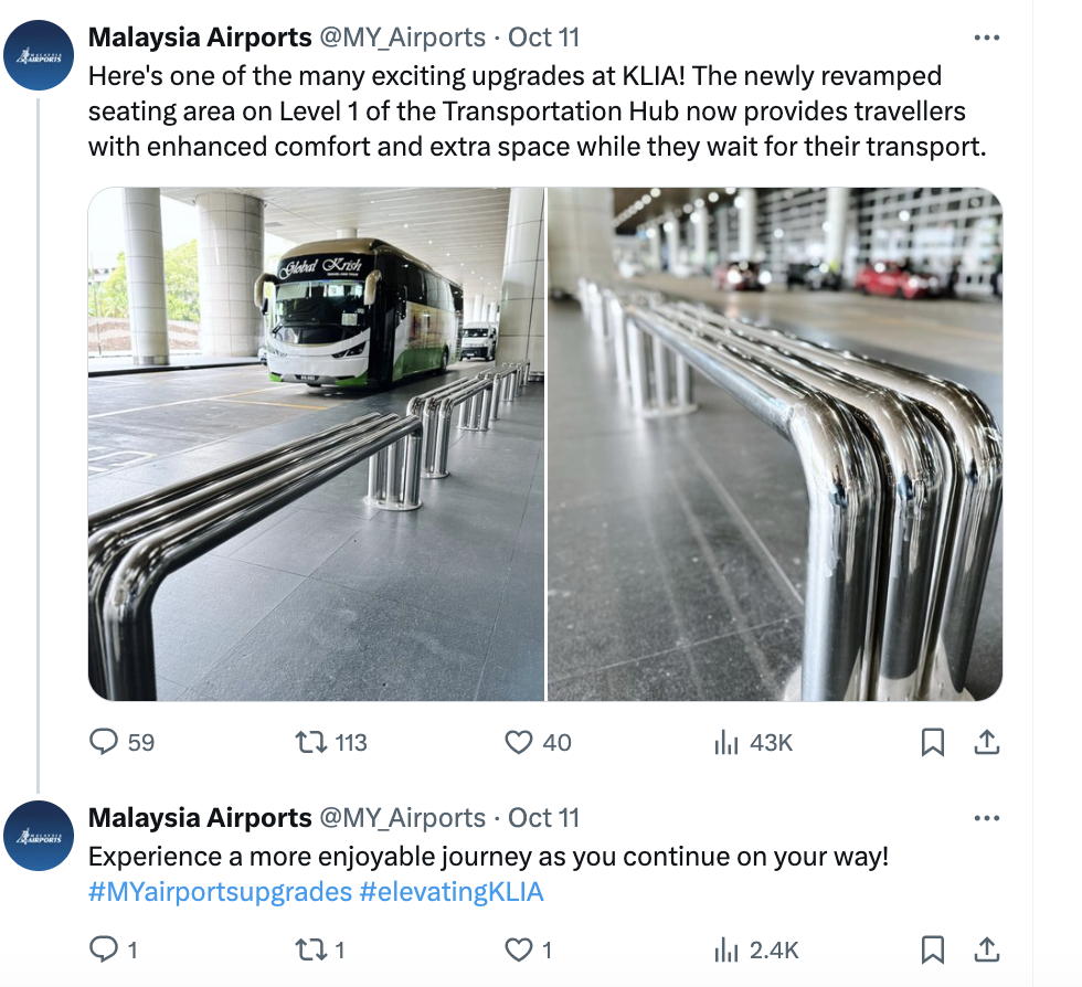 大马机场控股早前在社媒X贴文,指机场交通枢纽座椅区会翻新,为旅客提供更舒适体验和更大空间,让旅客在等候时更加舒适,然后,网友却对此不买账。