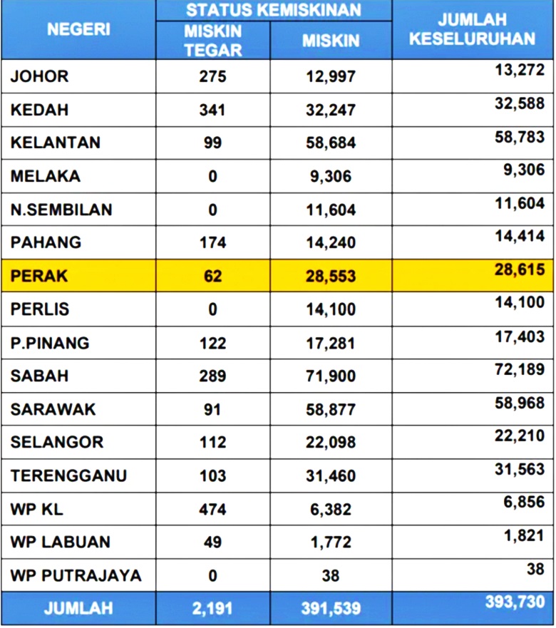 然而,令人欣慰的是,布城、马六甲、玻璃市和森美兰并没有出现极端贫穷人口。