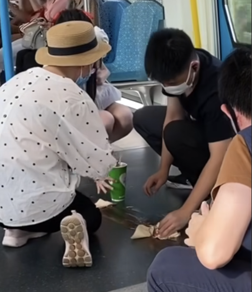同车厢的临近的搭客看到,自动自发的上前帮忙黑衣男子,拿出自己的纸巾,帮忙擦拭地板。