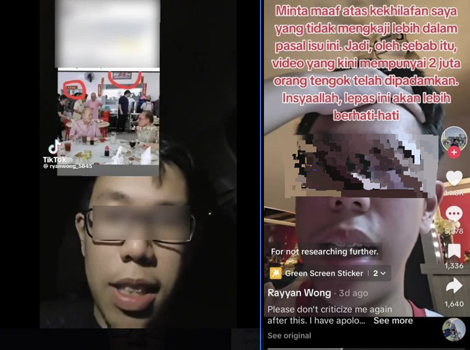 接着,Rayyan Wong随后发布视频指出,这家新自立餐室没清真认证,而该视频则被不少网民挞伐,Rayyan Wong意识到事态严重后更新视频道歉,表示自己应在了解情况前才发布内容。
