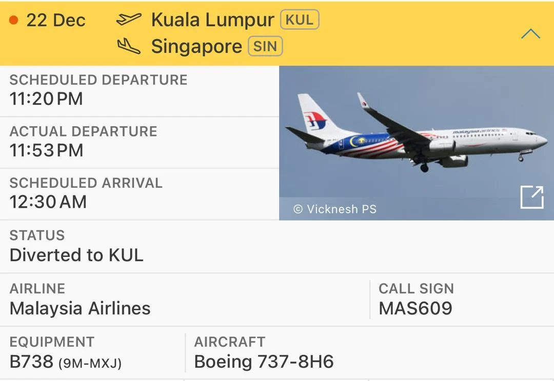 这架班机编号为MAS609,原定在昨晚11时20分从吉隆坡国际机场起飞,预计凌晨晨12时30分飞抵新加坡樟宜机场。