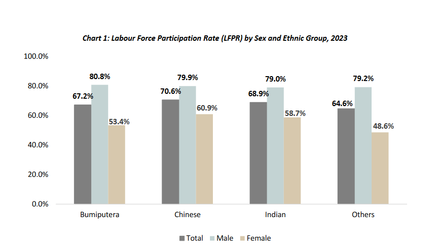 大马统计局数据显示,按族群划分,2023年我国的劳动力参与率(LFPR)华裔最高达70.6%,接下来是印裔(68.9%)、土著(67.2%)和其他(64.6%)。