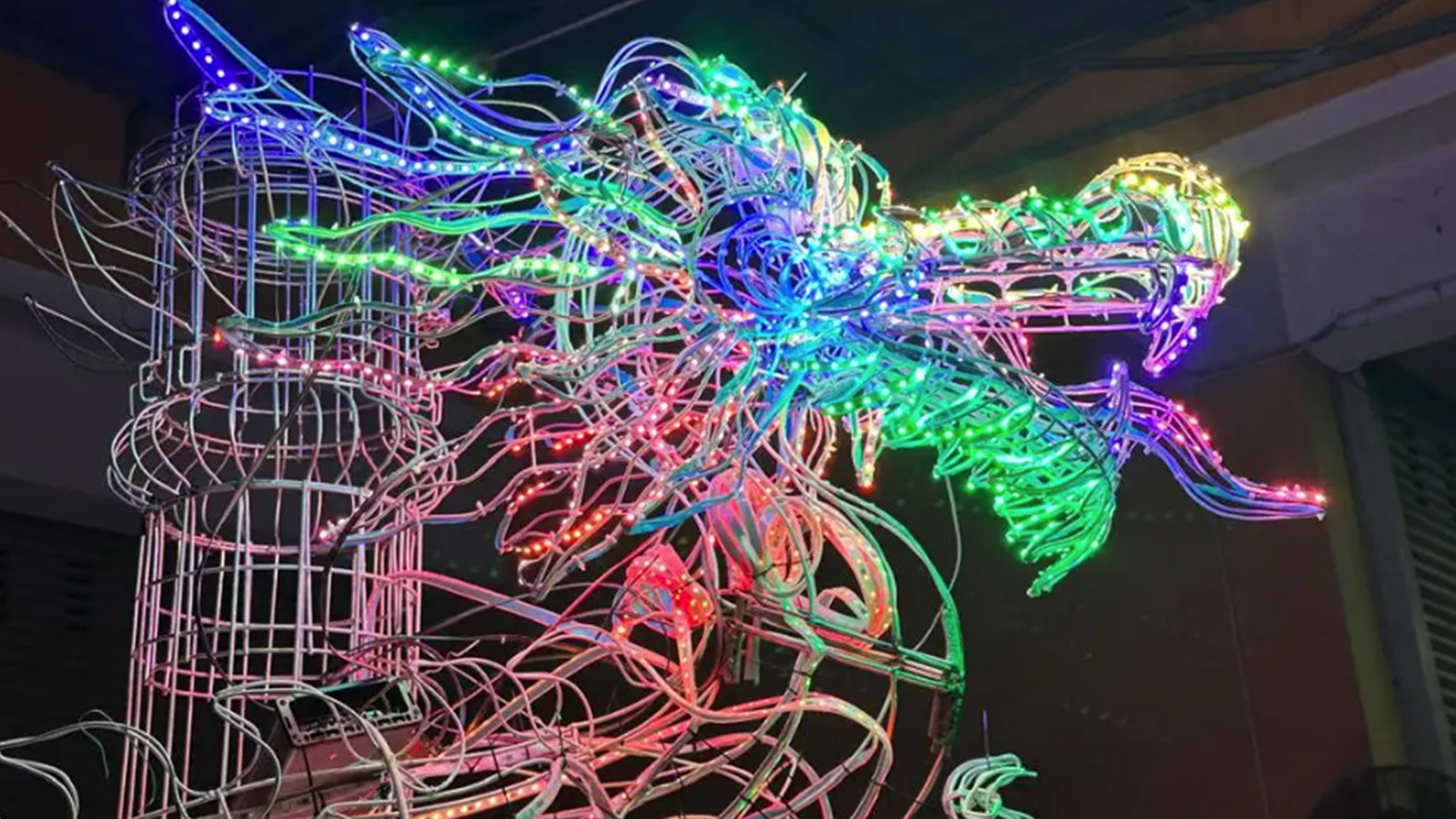 纪金利老师分享道:“我们称之为彩灯,因为它的布料色彩斑斓,灯光一亮起,就能吸引人们的目光,七彩的光芒带来了视觉的震撼。”