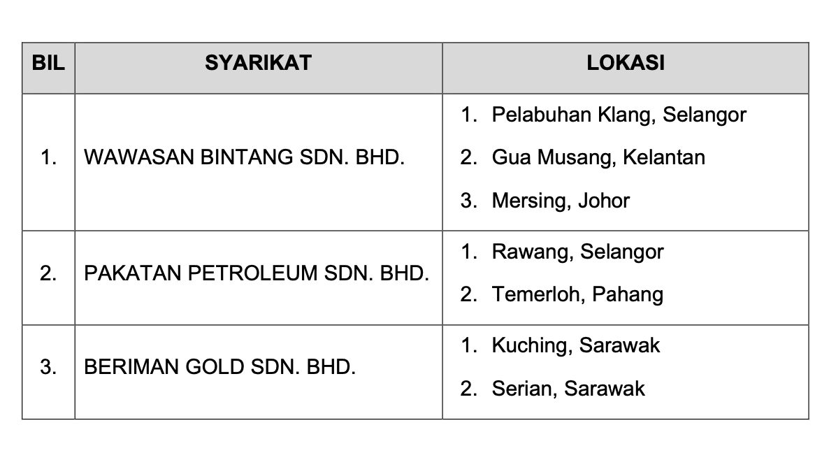 这3家公司分别为WAWASAN BINTANG私人有限公司、PAKATAN PETROLEUM私人有限公司,以及BERIMAN GOLD 私人有限公司。