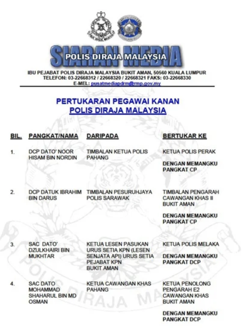大马皇家警察部队(PDRM)宣布36名警官擢升或调职,任期从3月10日起生效,而霹雳及马六甲则将会迎来新总警长!