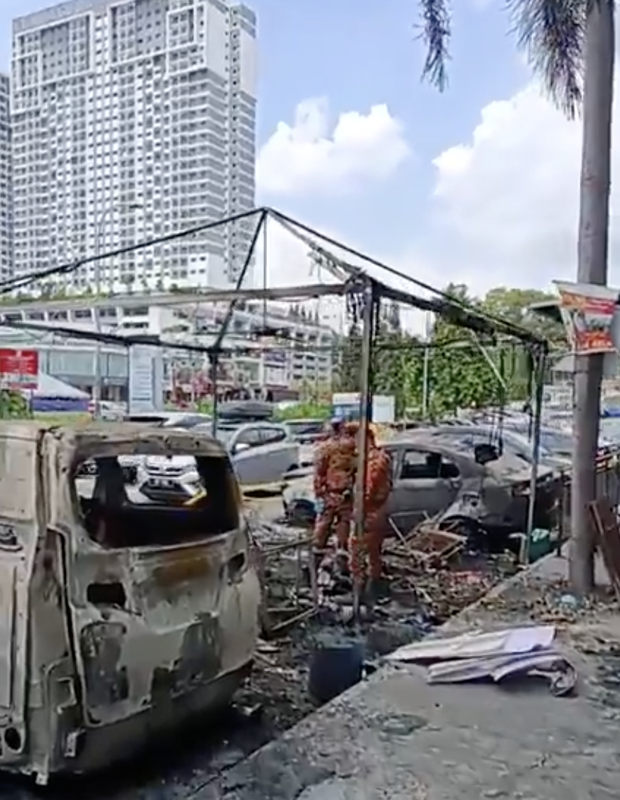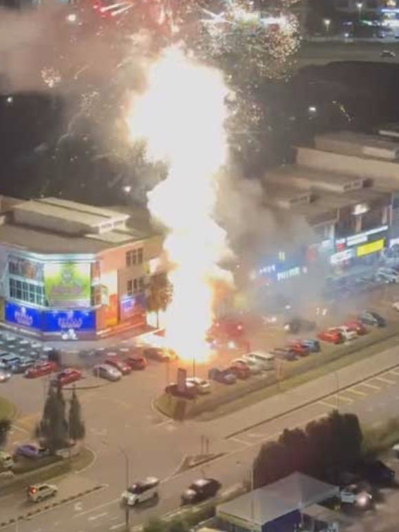 这个昨晚在社媒上广传,因为起火燃烧接着烟花四射画面看人看了心惊,引发很多人关注的事故,而这次案件也波及5部交通工具,分别是停放在摊位旁的3辆轿车和2辆摩托车摩被烧毁。