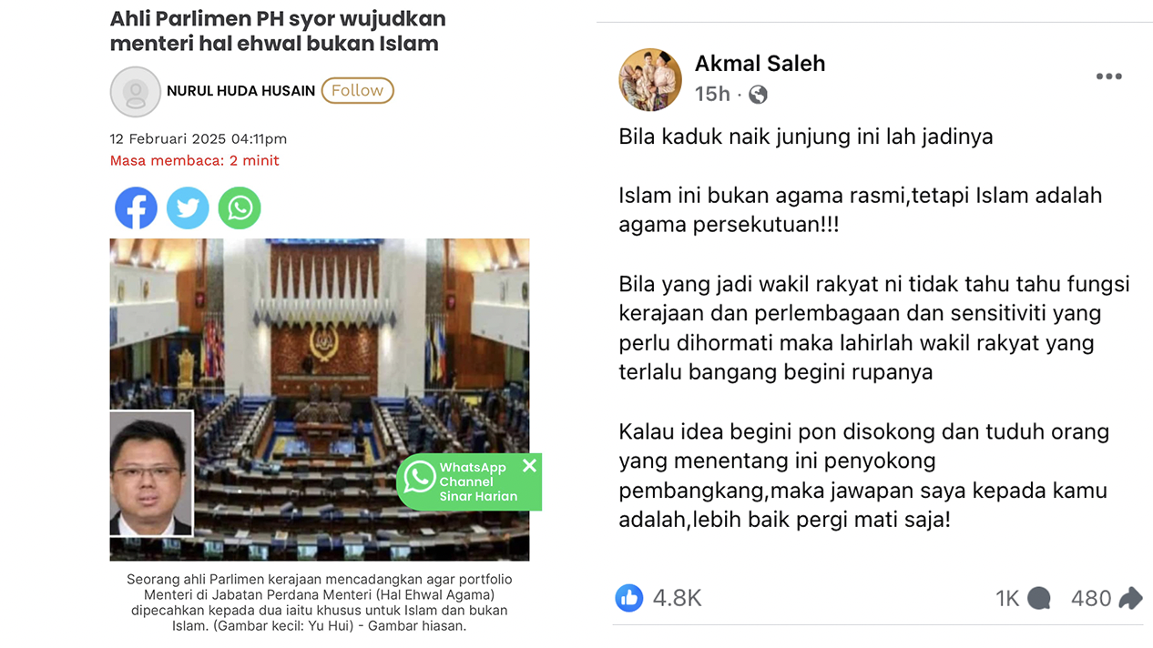 另一方面,作风犀利的阿克玛,也在脸书撰文猛烈批评,他说,若增设非伊斯兰事务部长建议得到支持,反对的却被视为支持反对党,那他的答案将是:“最好去死”。