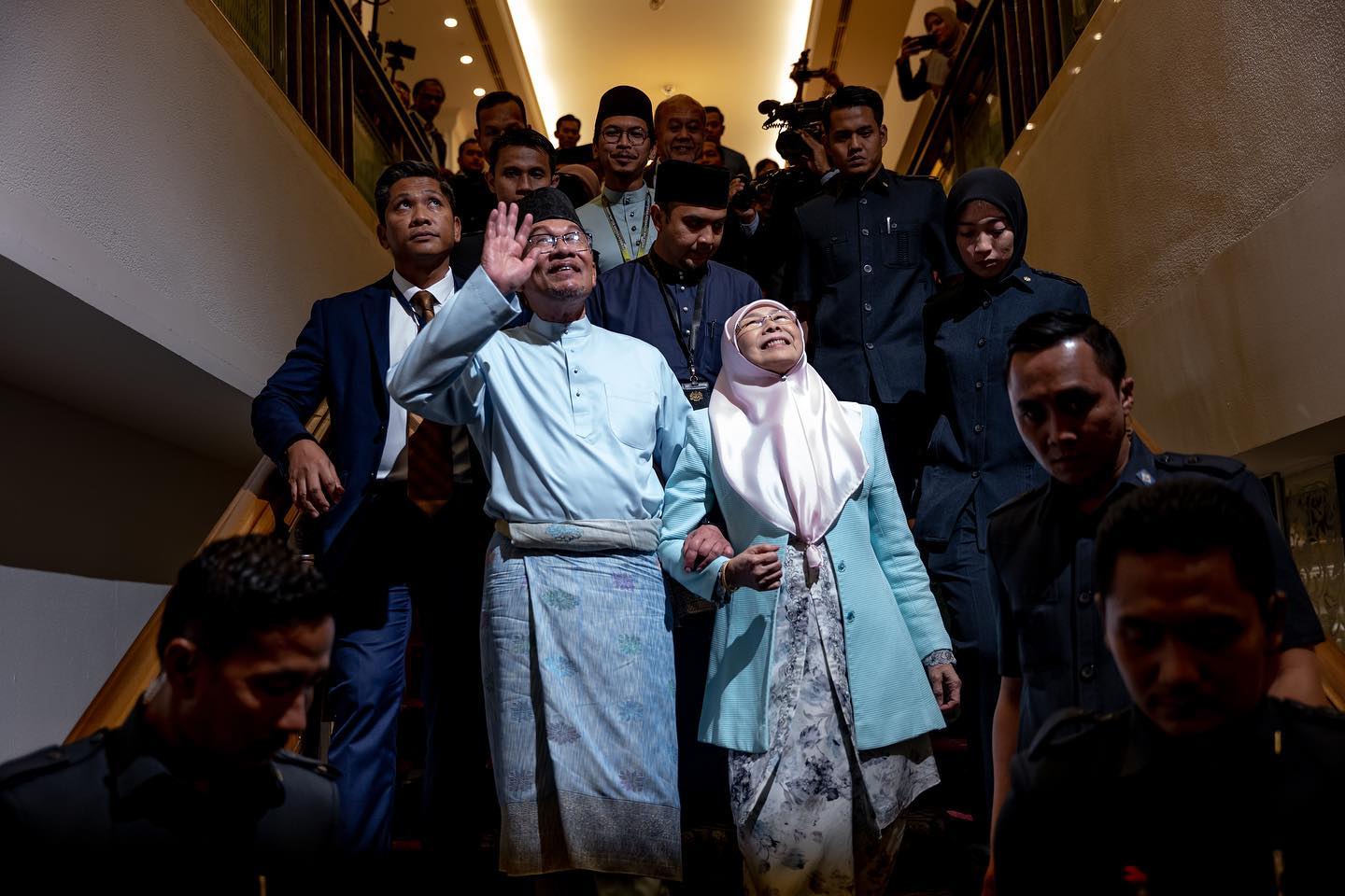 宣布2023年财政预算案后,安华挽著旺阿兹莎的手离开国会。