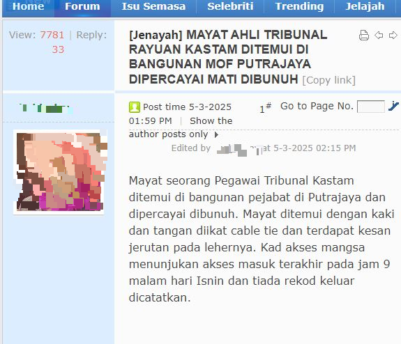较早前,有人今午在佳礼网论坛发帖,指一名关税仲裁官员的遗体在布城的办公室大楼内被发现,疑似遭谋杀,手脚被扎带捆绑,颈部有勒痕。