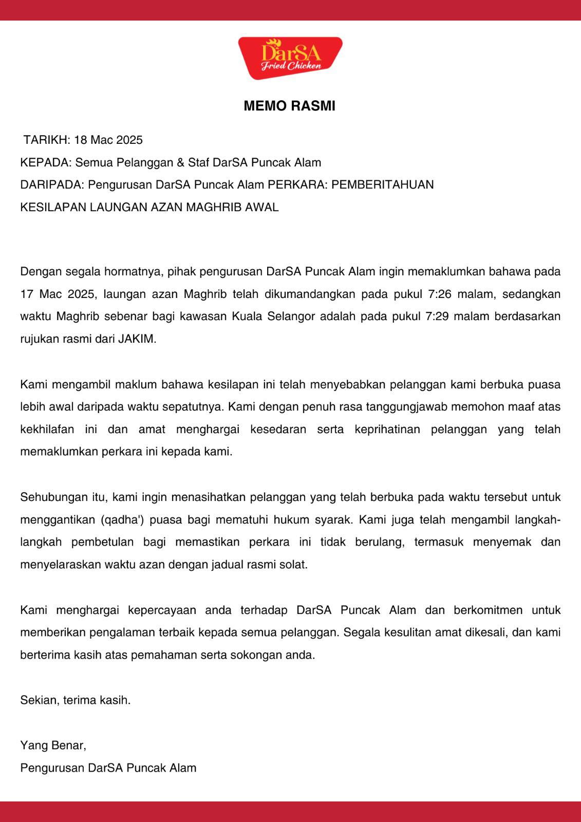 本地炸鸡店DFC提早播放昏礼祈祷的宣礼,导致顾客提早开斋,该炸鸡店发文告道歉,并呼吁涉事人员进行补行斋戒。