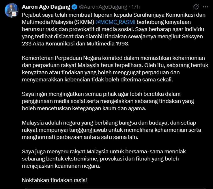 艾伦达干呼吁民众负责任地使用社交媒体,避免发表可能激化宗教或种族紧张局势的言论。