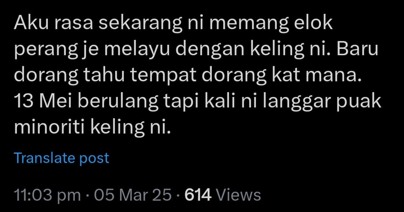 一名巫裔网民在3月5日发文说:“我认为现在是马来人和吉灵人(Keling/印裔)交战的时候,那他们才懂得自己的位置在哪里。513重演,但这次是针对少数的吉灵人。”