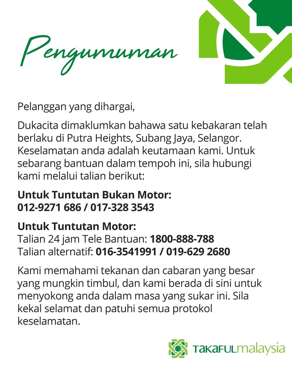 TAKAFUL也呼吁,受事件影响的保客致电012-9271686或017-3283543以提出非汽车索赔,至于汽车索赔则可联系1800-888-788。