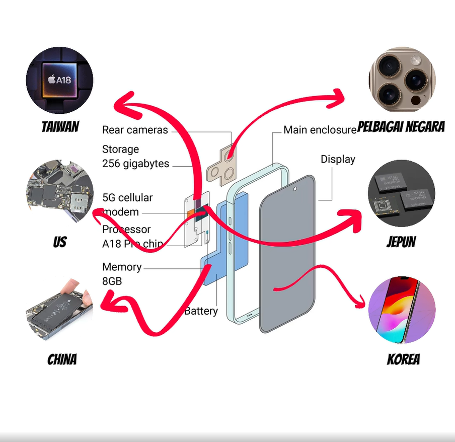 他解释,iPhone的制造组件来自世界各地,包括台湾的芯片、韩国的屏幕、中国的电池、美国的调制解调器(Modem)和内存、日本的存储器,以及来自多个国家的摄像头,最终在中国组装。