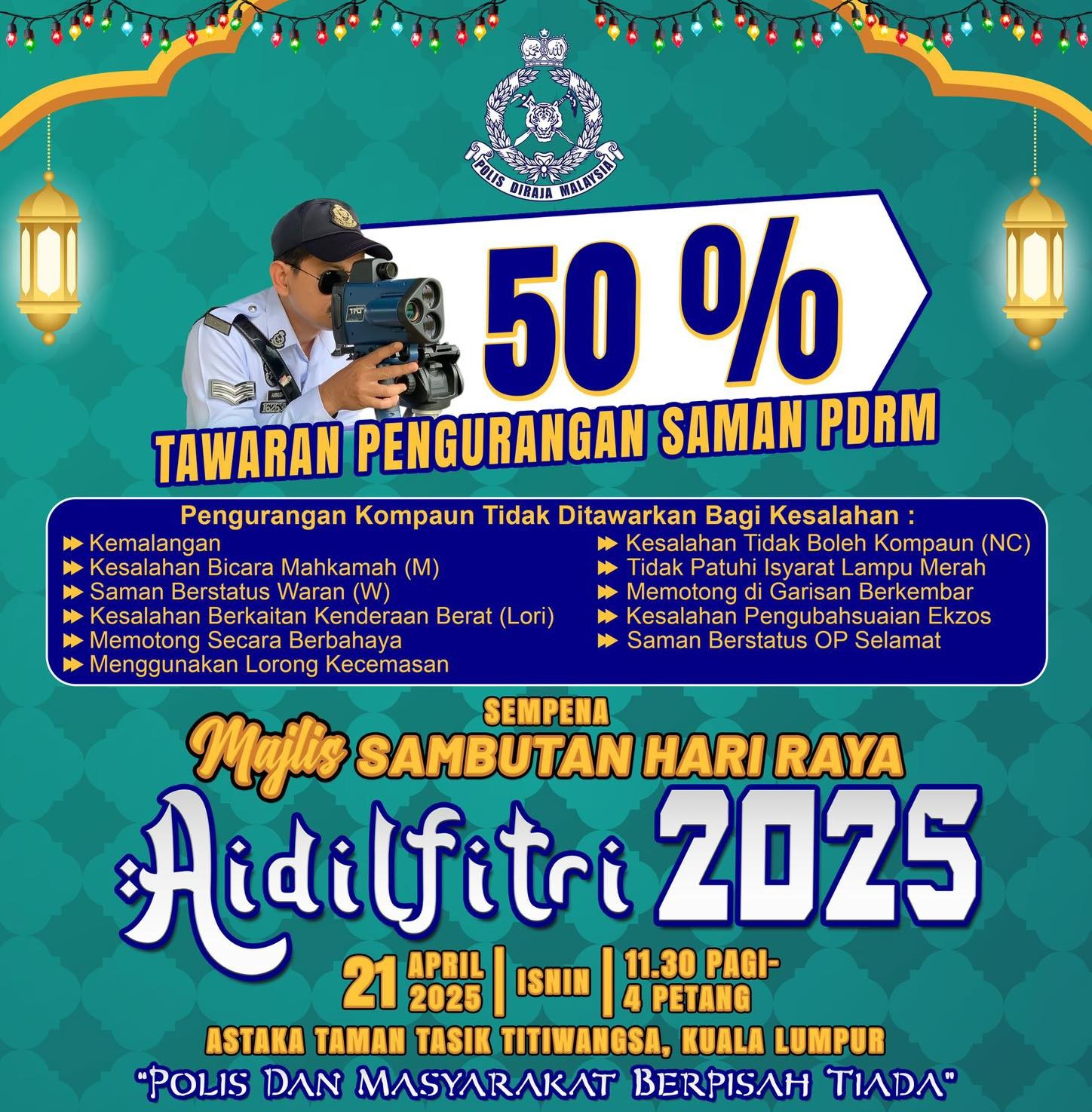 配合开斋节庆祝活动,警方将于本月212日(星期一)提供为期1天的交通罚单50%折扣优惠。