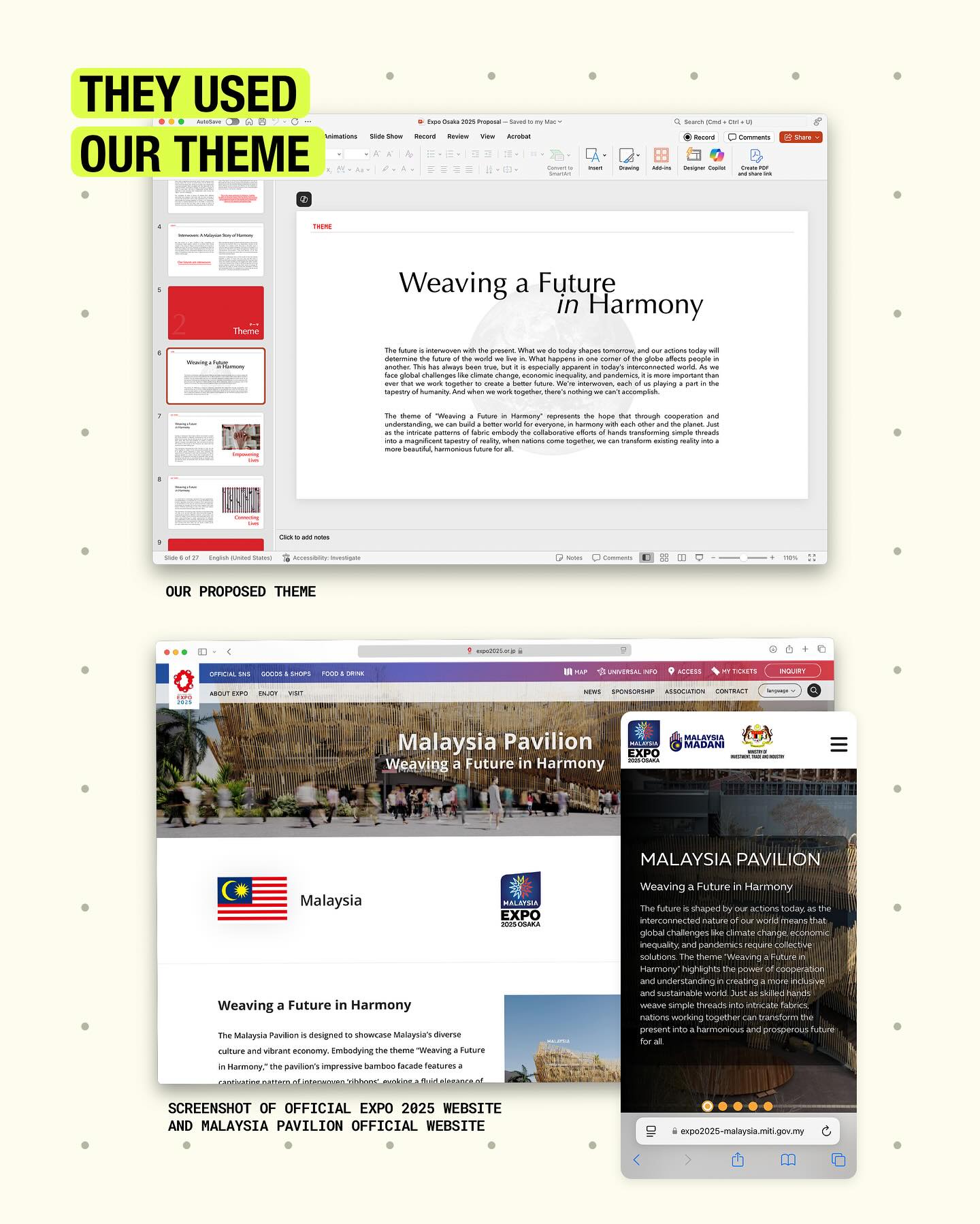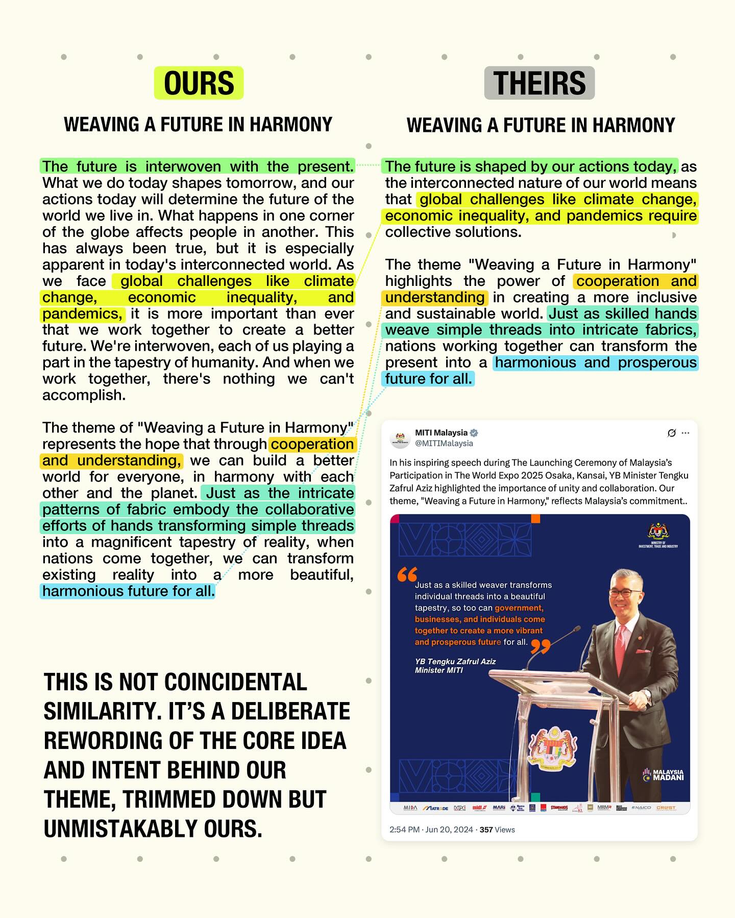一家创意顾问公司代表控诉,投资、贸易与工业部未经授权,使用其为2025年大阪世界博览会大马馆所拟定的创意方案,该部今日回应,已经展开调查,并保留采取法律行动的权利。