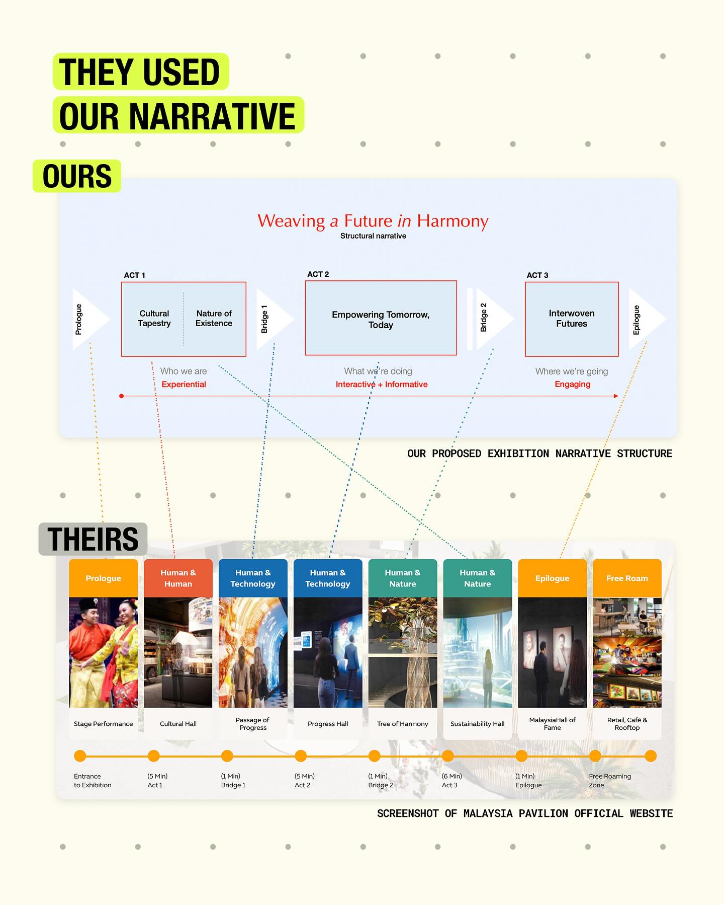 他说,公司随后投入约8个月时间,在紧迫时限下完成多项策划与提案,并多次获得投贸部即将正式委任的口头承诺,然而CMG却在2023年1月接获通知,指项目将改以公开招标方式进行。他称,投贸部及其指定承包商,在未经授权、未支付费用且未给予署名的情况下,几乎“原封不动”地采用他们早前所提交的完整策展概念,并将其用于大马馆官方发布的主题、结构与展陈内容之中。
