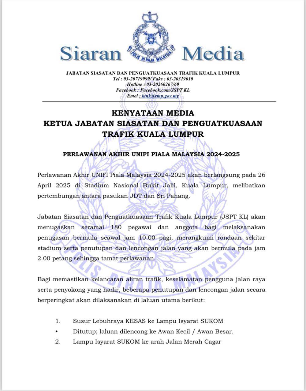 警方呼吁民众,提前规划行程,遵守执勤交警的指示,警方也鼓励民众改乘公共交通前往体育场,以减少交通阻塞。