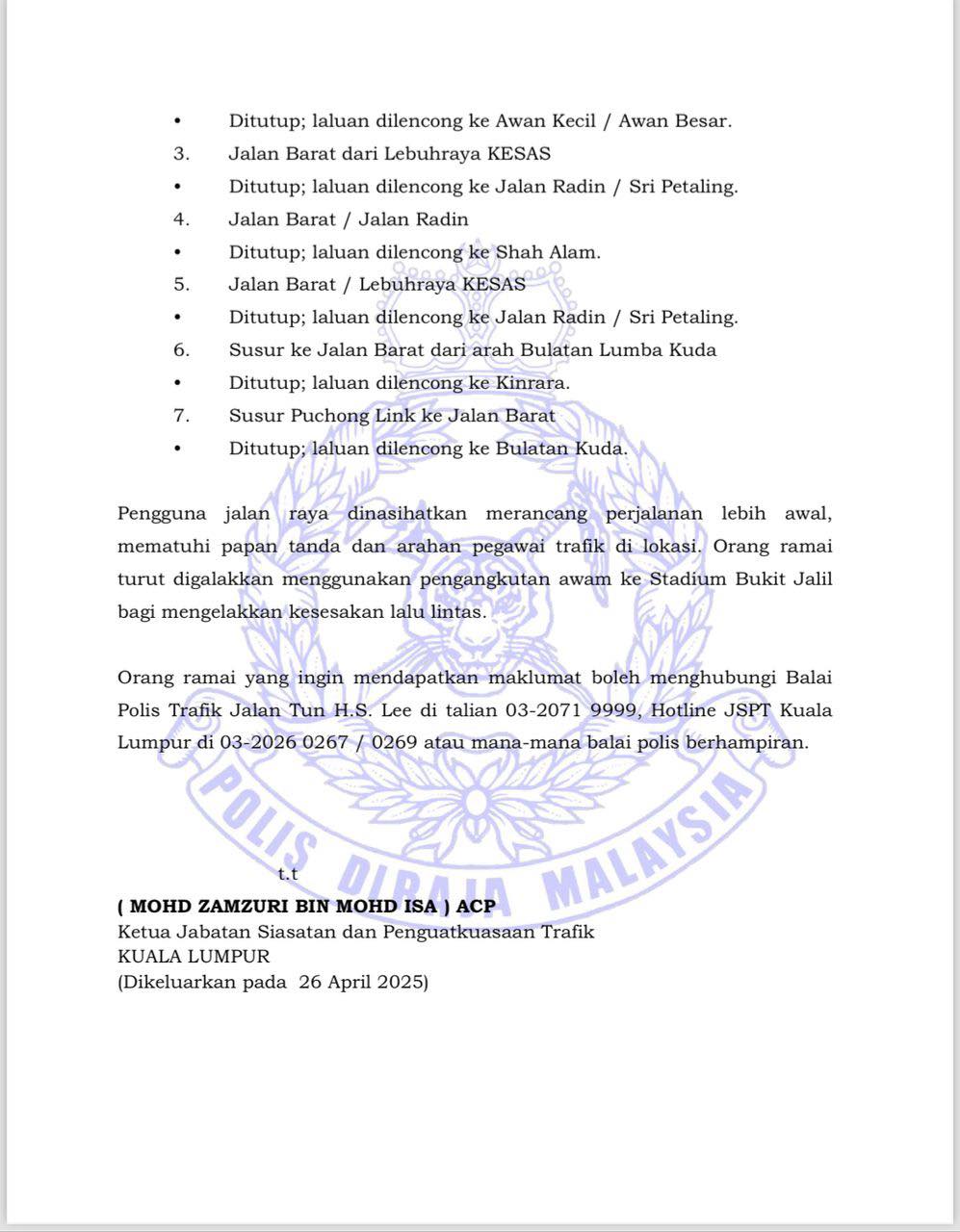 吉隆坡警察交通调查及执法组主任莫哈末占祖里发文告指出,今午2时起,体育馆周边7条道路将封路和改道,直到赛事结束。
