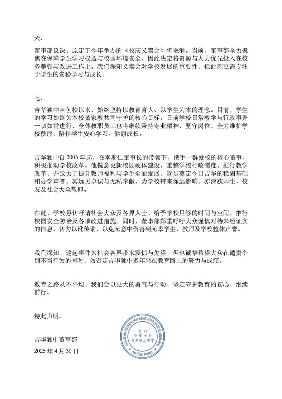 七、吉华独中自创校以来,始终秉持“以学生为本”的办学理念。董事部与家协坚守这一核心精神,致力于营造一个安全、有尊严的学习环境。事件发生后,全体教职员依旧坚守岗位,日常教学与行政运作如常进行,校园秩序稳定。
