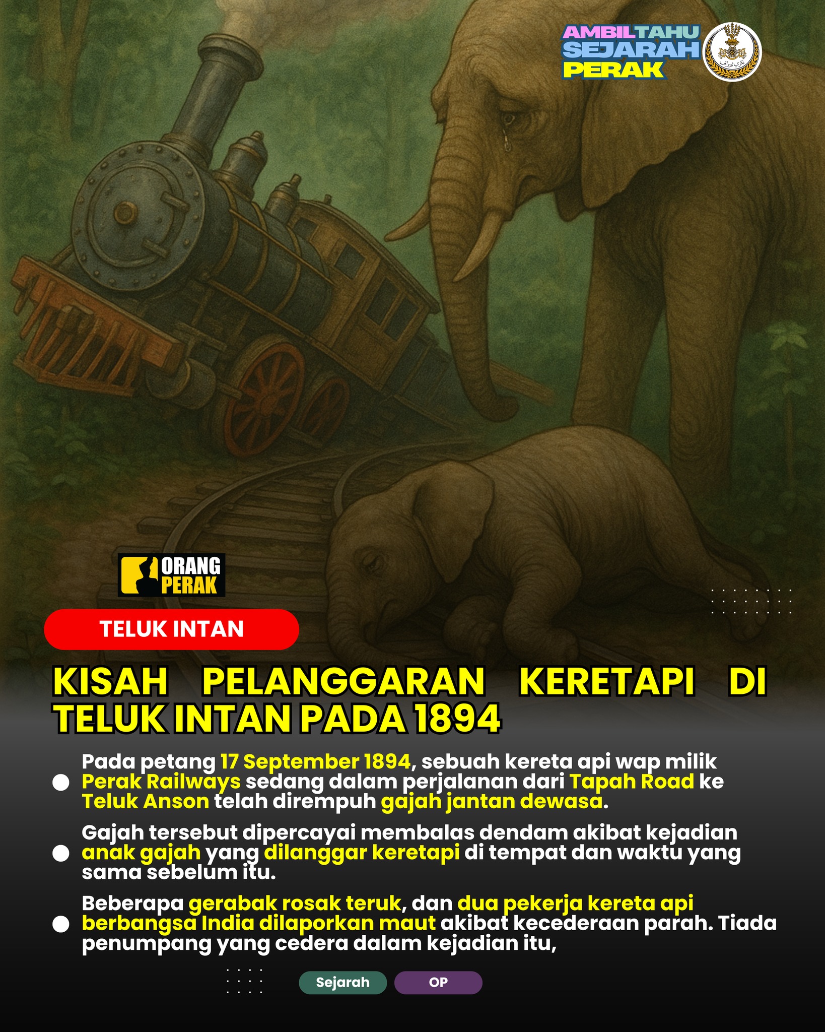 据《霹雳人》(Orang Perak)在脸书叙述,事故列车时速高达64至80公里,这对当时使用蒸汽机技术的火车而言已属极速,一群野象似乎早已守在铁道,领头者是一头体积庞大的雄象,最终车头遭雄象猛撞,冲击力巨大。