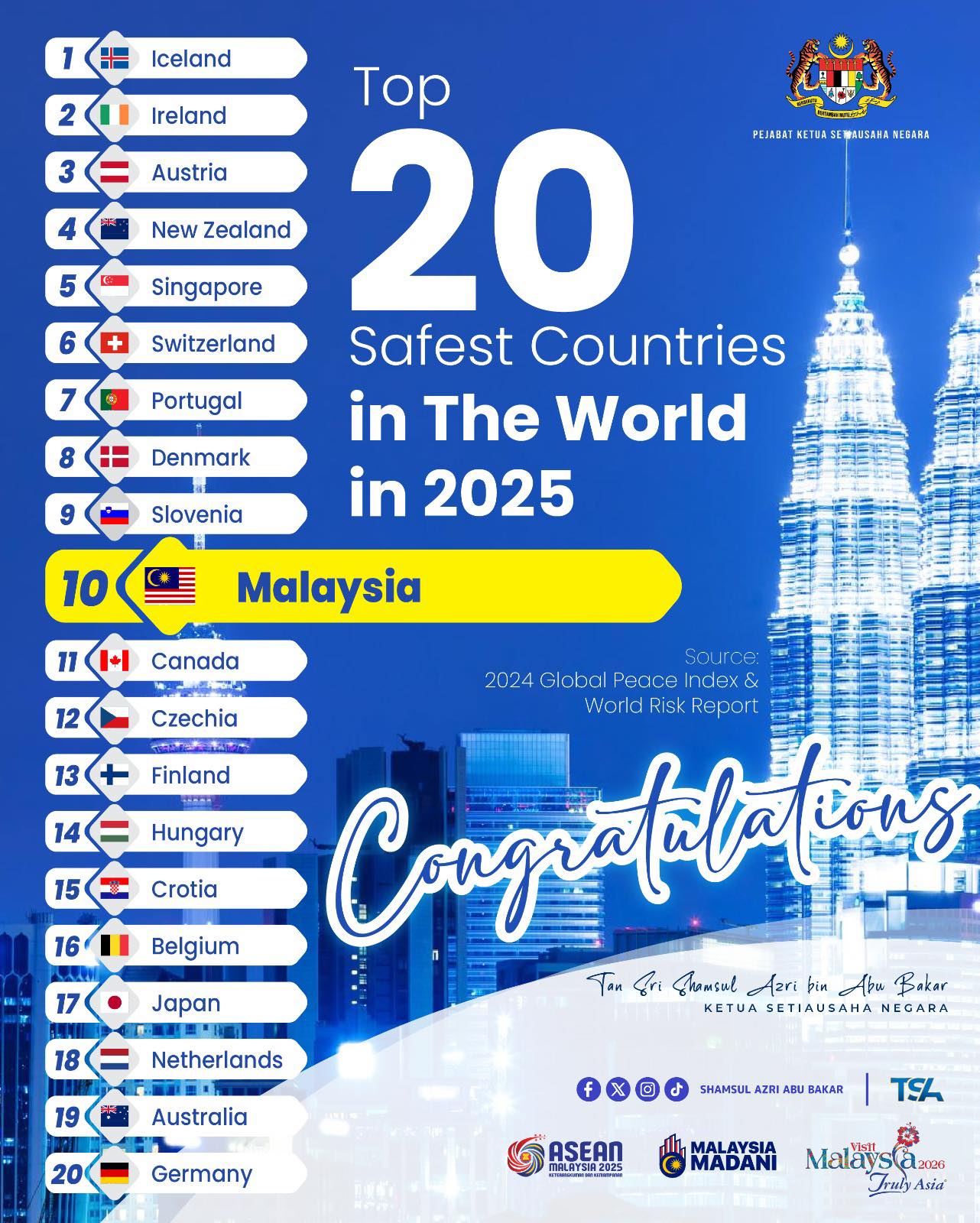 在上述榜单中,大马位列第10名,是亚洲第二,仅次于新加坡(第5名)。冰岛继续蝉联全球最安全国家。