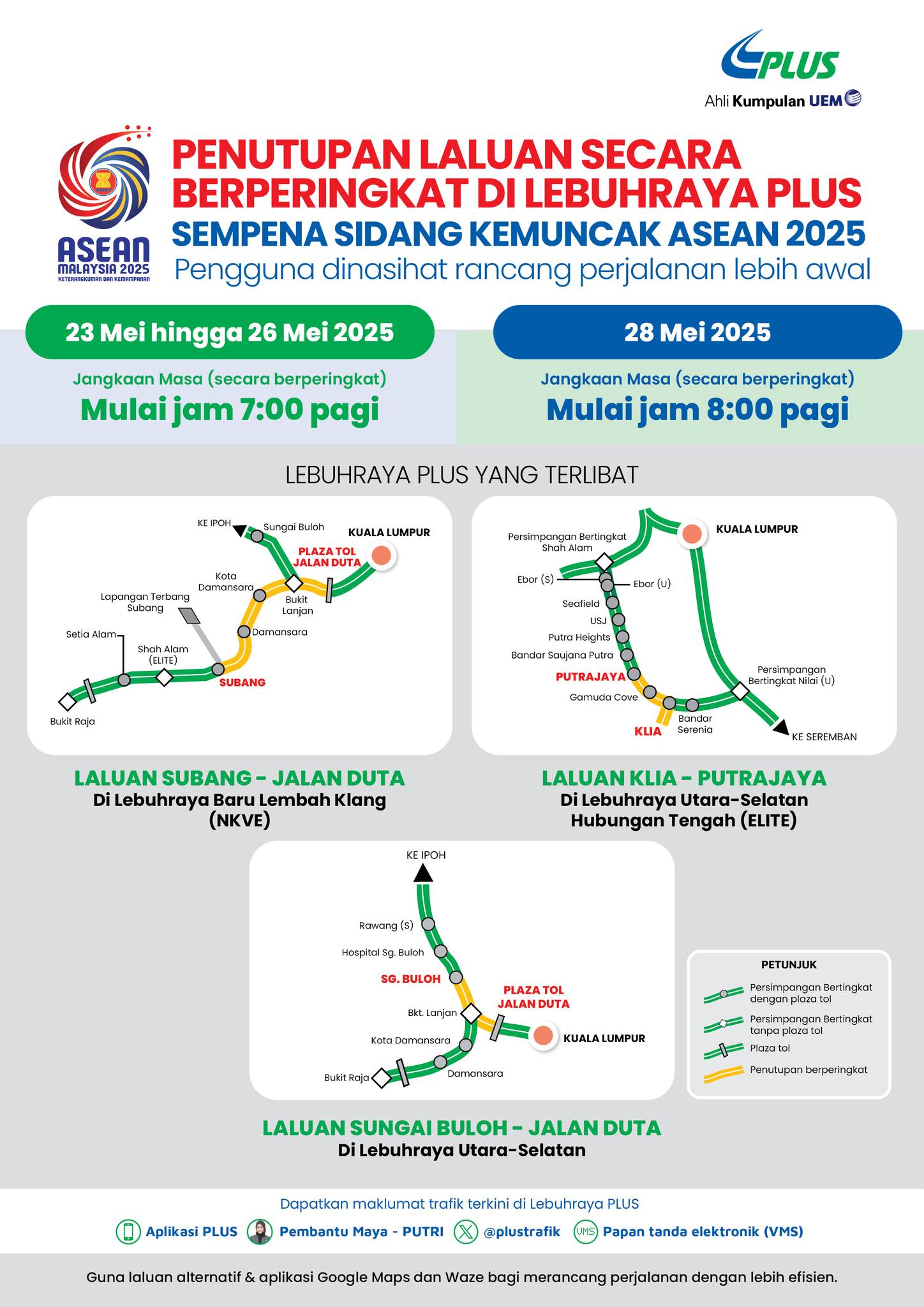 此外,南北大道公司(PLUS)也发文告呼吁民众,提早规划行程,尤其是前往吉隆坡国际机场和梳邦空军基地的驾车人士。