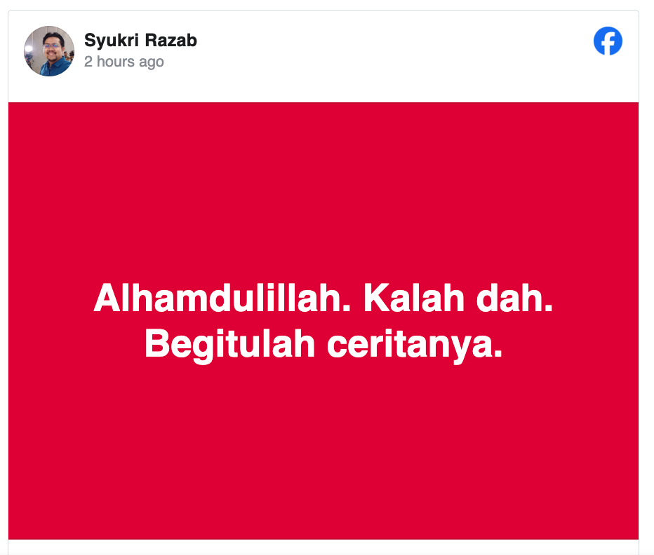 根据《星报》较早前报道,不仅如此,也是经济部长的拉菲兹的特别事务官阿末苏克里在脸书贴文写道:“输了,就是这样了。”