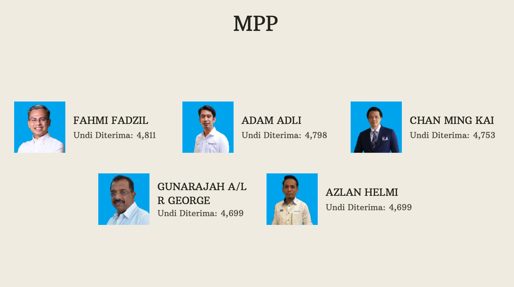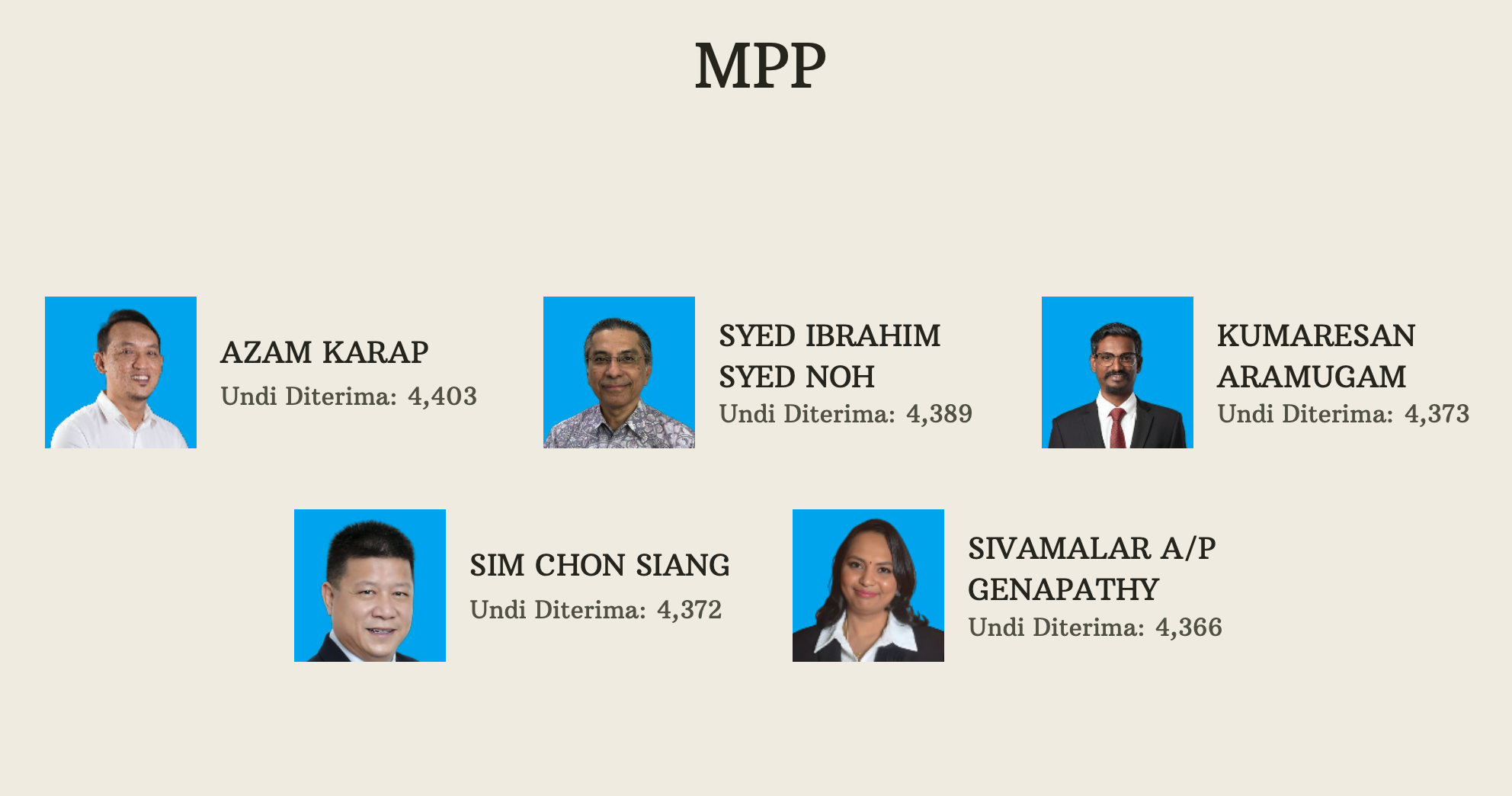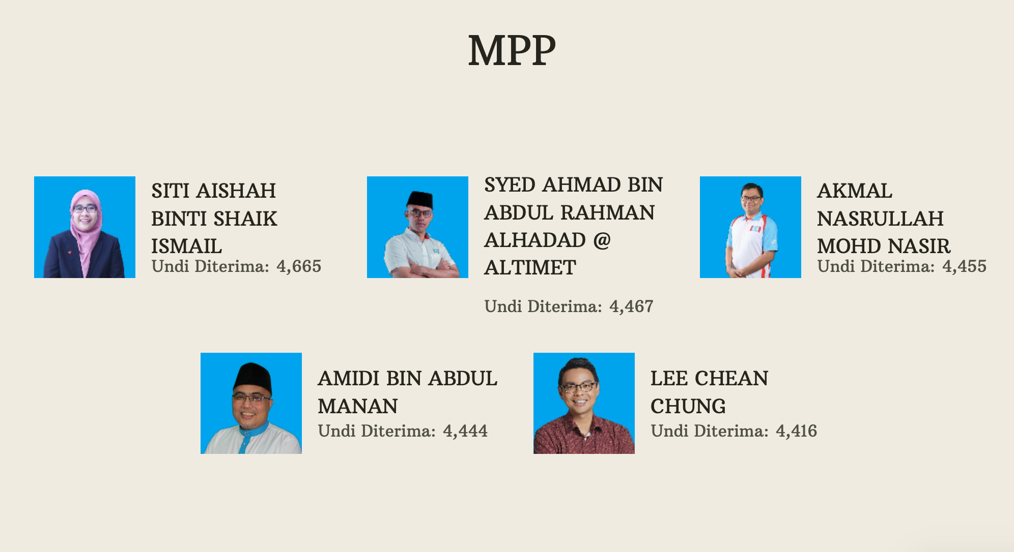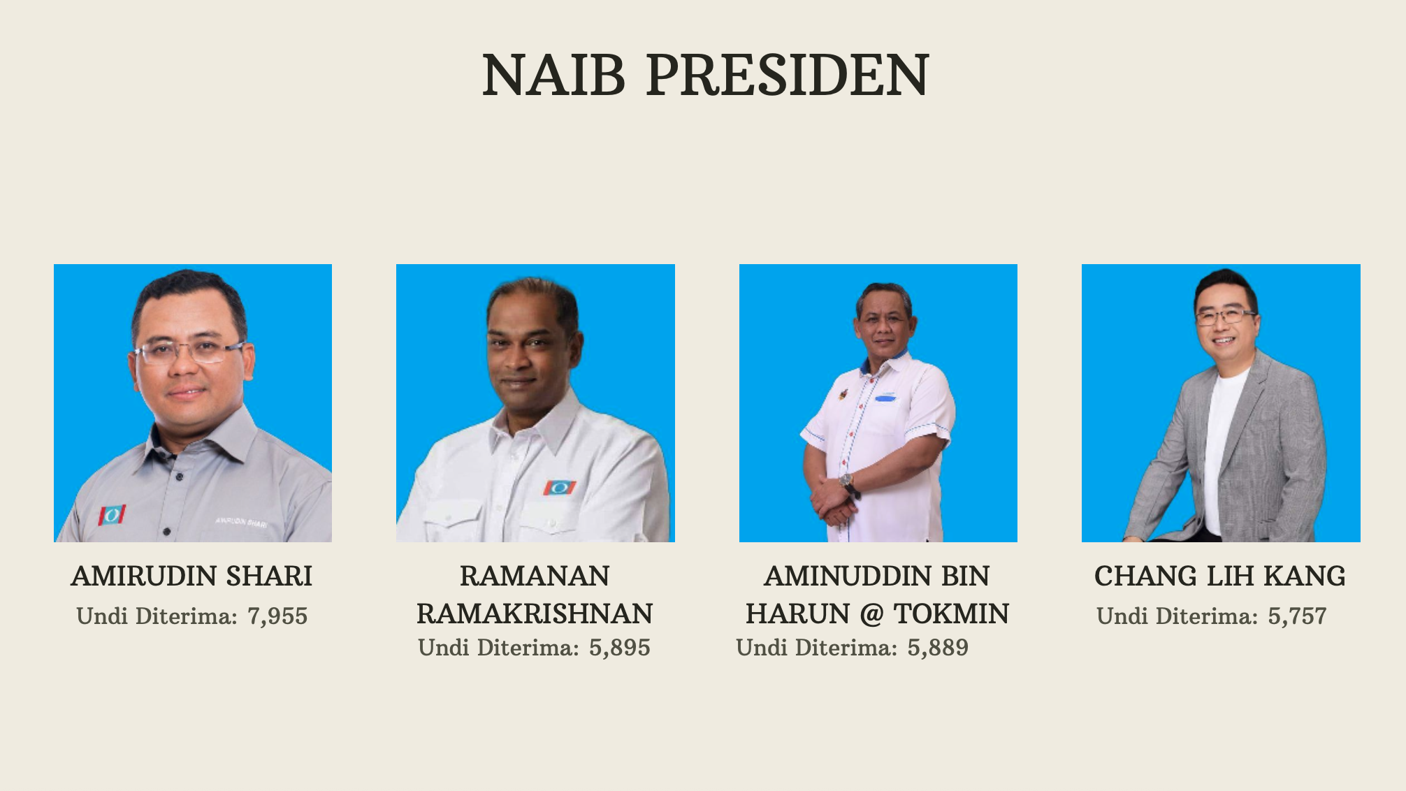 较后,正式出炉成绩是:阿米鲁丁(7955)、拉马南(5895票)、阿米努丁(5889多票)和郑立慷(5757票)。