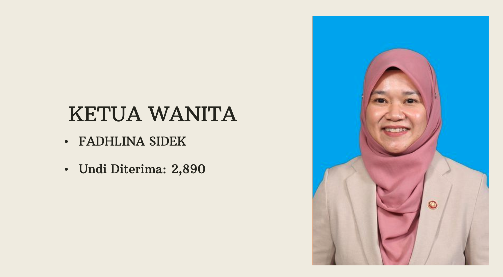 妇女组方面,教育部长法迪娜成功蝉联,以2890击退罗兹雅。