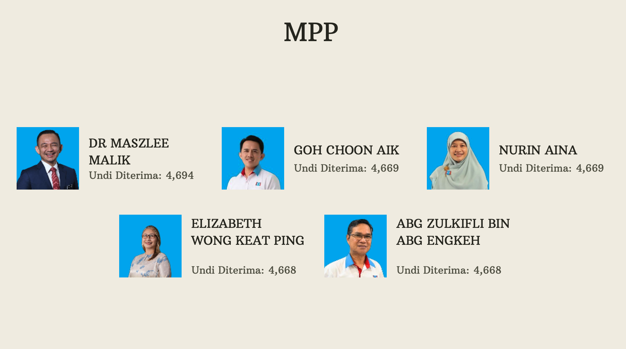 法米(4811)、阿当阿迪(4,798)、曾敏凯(4753)、古纳拉惹(4699)、阿兹兰希米(4699)、马智礼(4694)、吴俊益(4669)、努琳(4669)、黄洁冰(4668)、祖基菲利(4668)、西蒂爱莎(4665)、阿迪门(4467)、阿克玛(4455)、阿米迪(4444)、李健聪(4416)、阿占卡力(4403)、赛依布拉欣(4389)、古玛乐山(4373)、沈春祥(4372)及西华玛菈(4366)。