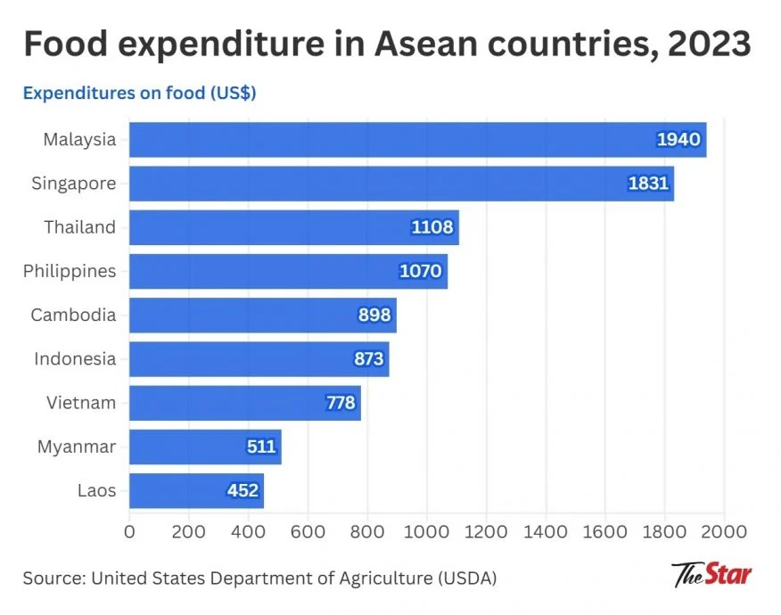 新加坡紧随其后,人均食品支出为1831美元,其他如泰国(1108美元)、菲律宾(1070美元)和柬埔寨(898美元)则明显低于大马。