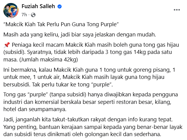 她今日在脸书发文,以题为:Makcik Kiah不需要使用紫色桶(商用煤气),以简单明了的例子,解释近日引发争议的煤气课题。