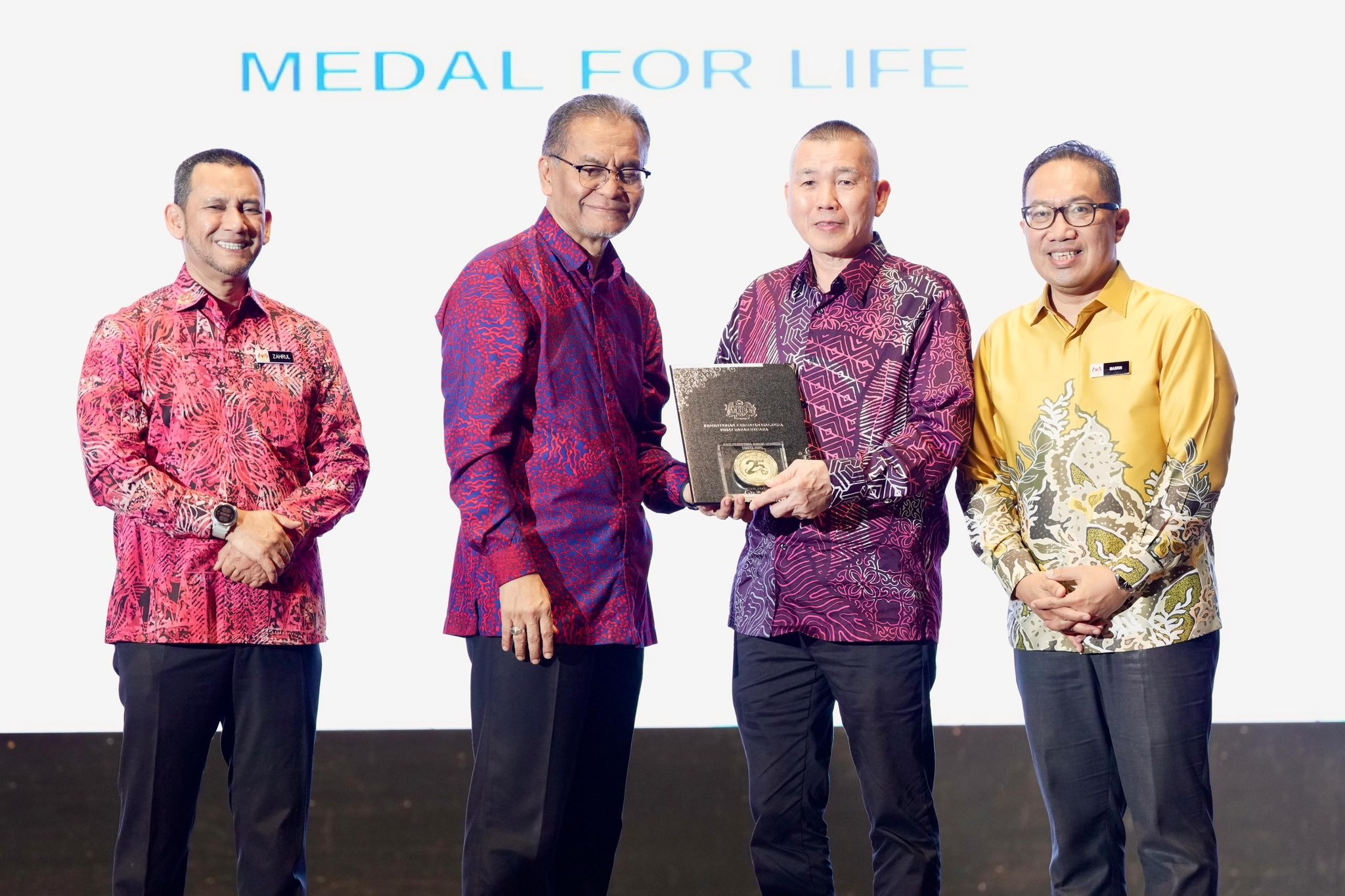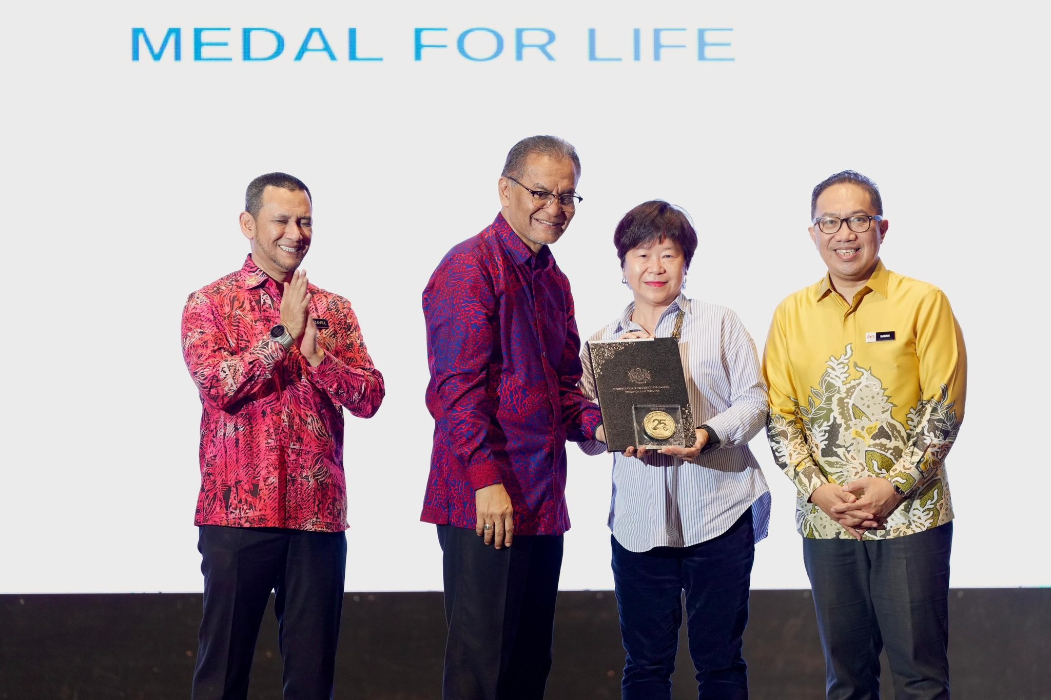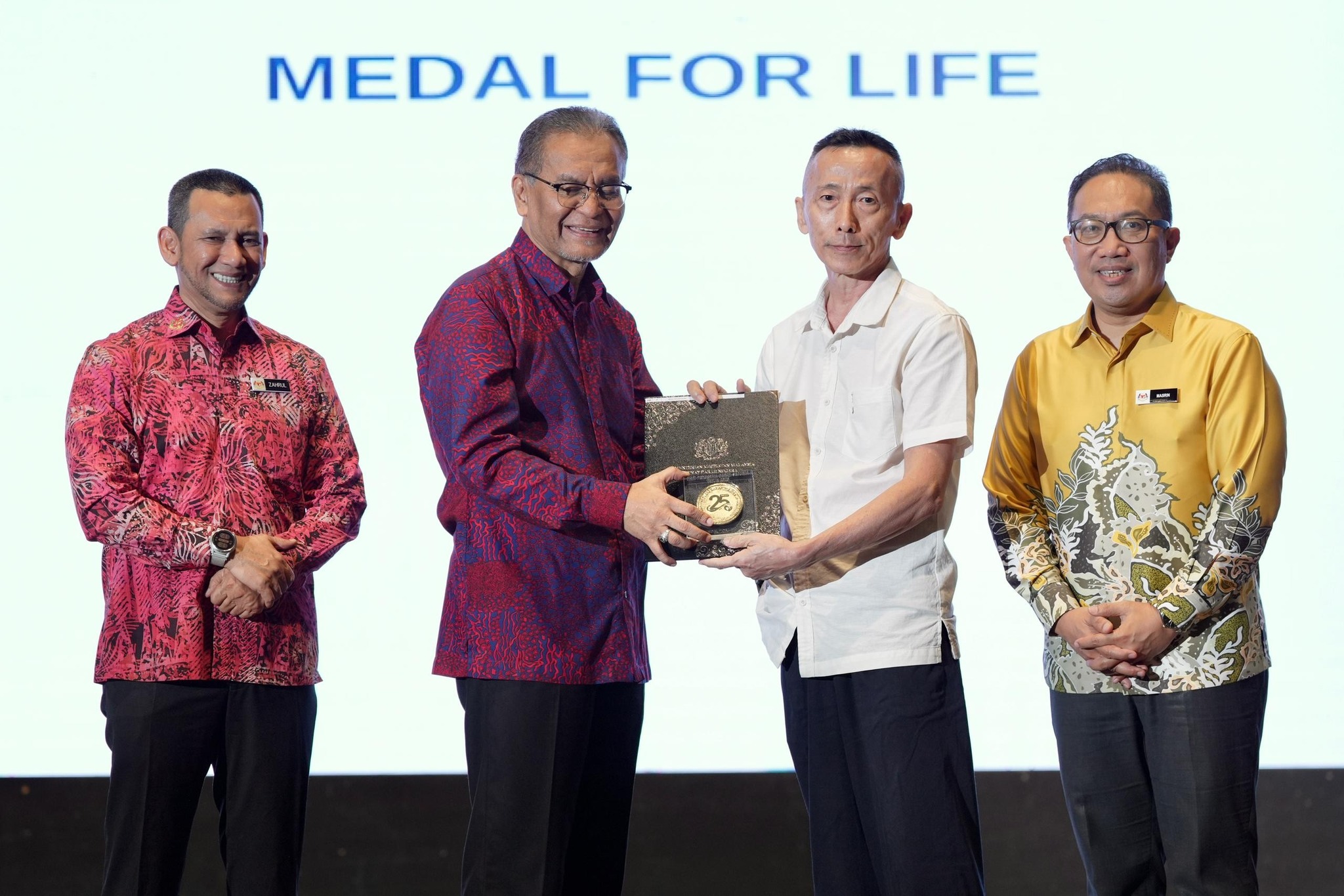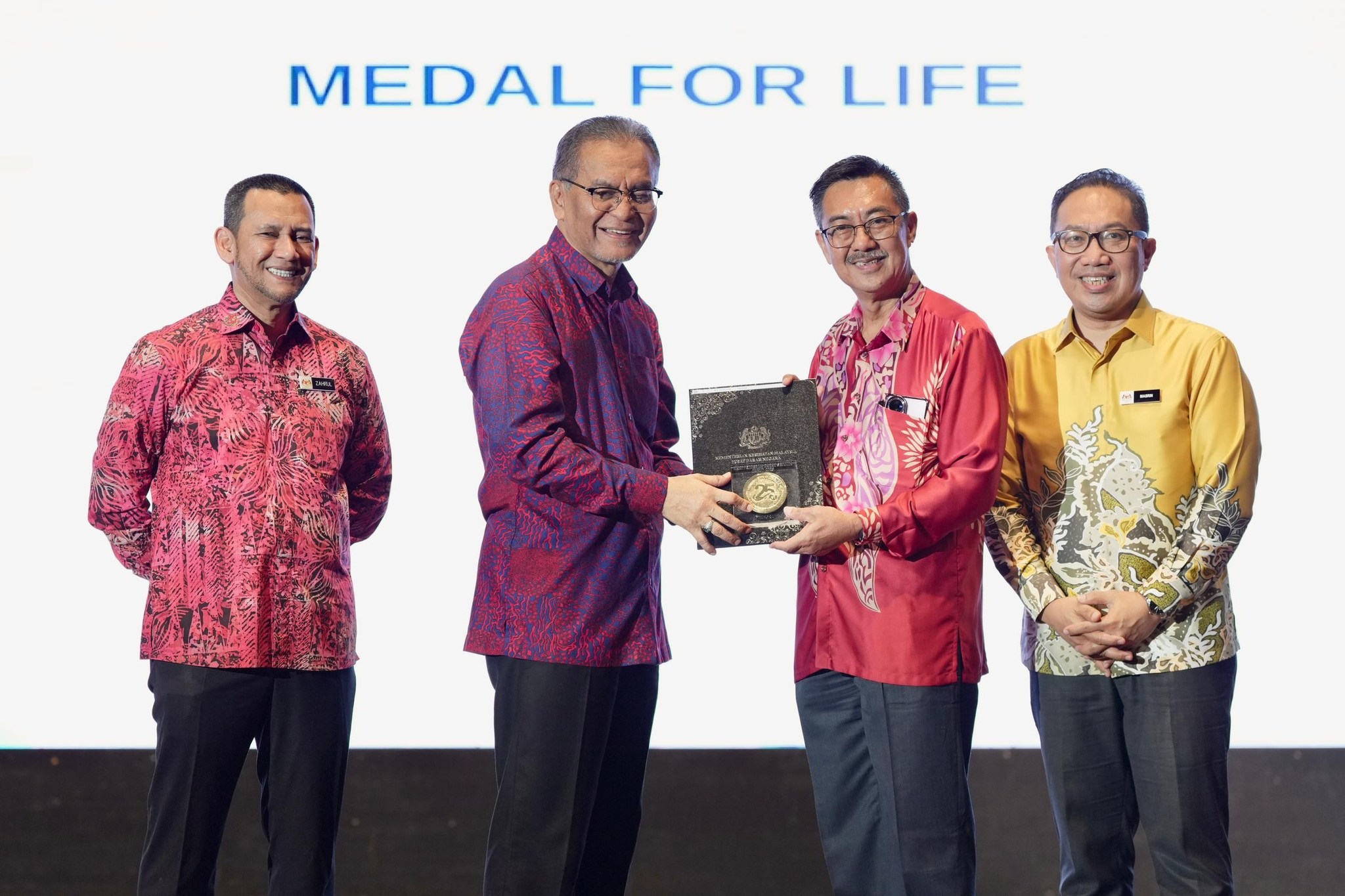 卫生部长祖基菲里昨天在2025年全国世界献血者日感恩庆典暨国家血库中心银禧纪念庆典上,颁发“生命勋章”给4名捐血超过500次的捐献者,他们是陈依玲、Liew Chin Yap、Liew Ship Boo及Ong See Kim。