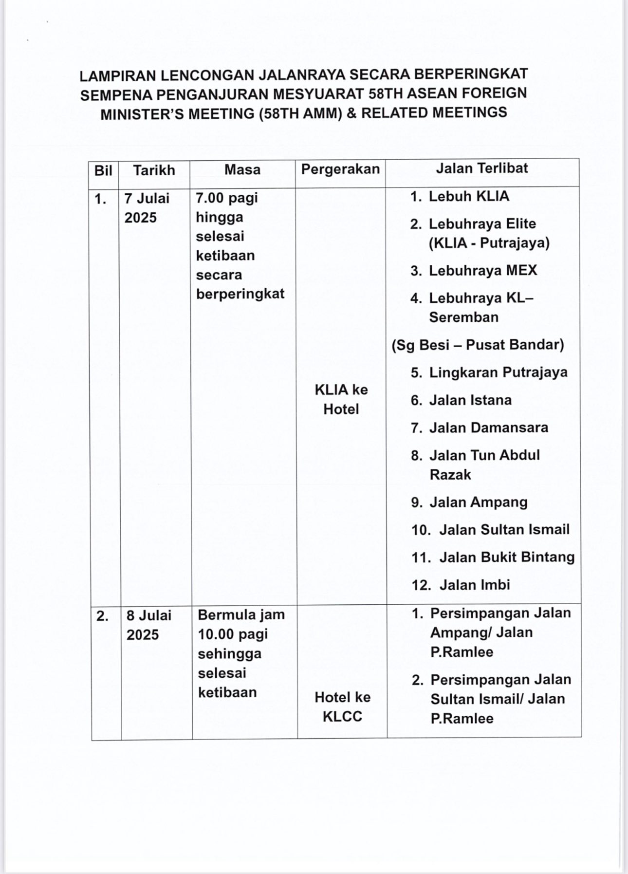 配合第58届东盟外交部长会议,巴生谷多个路段将从下周一(7日)开始分阶段封路,直到下周五(11日)。