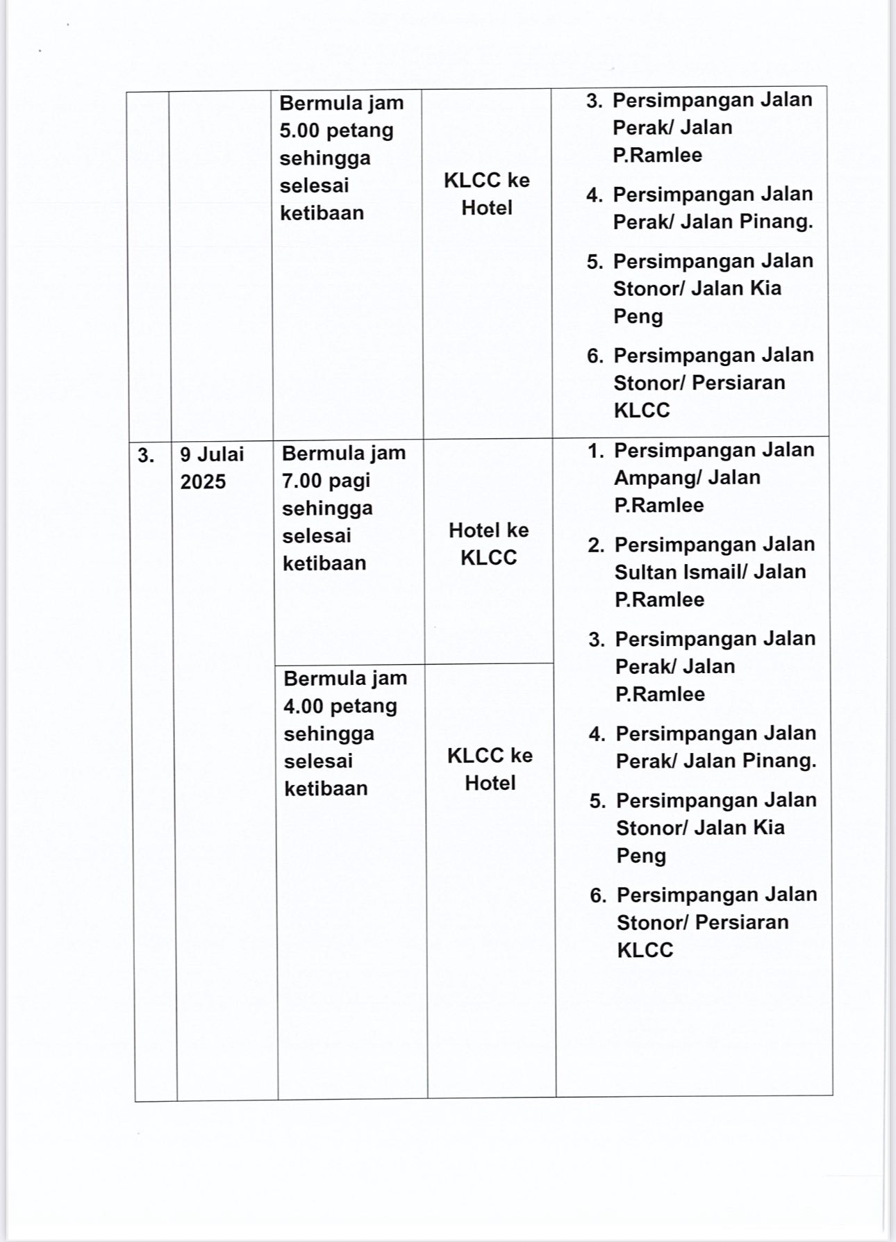 警方在7月7日从机场护送贵宾抵达市中心时,Elite、Mex及隆芙大道3条高速大道也会分阶段封锁,其他受影响道路包括吉隆坡国际机场大道、布城公路、王宫路、白沙罗路、敦阿都拉萨路、安邦路、苏丹依斯迈路、武吉免登路及燕美路。