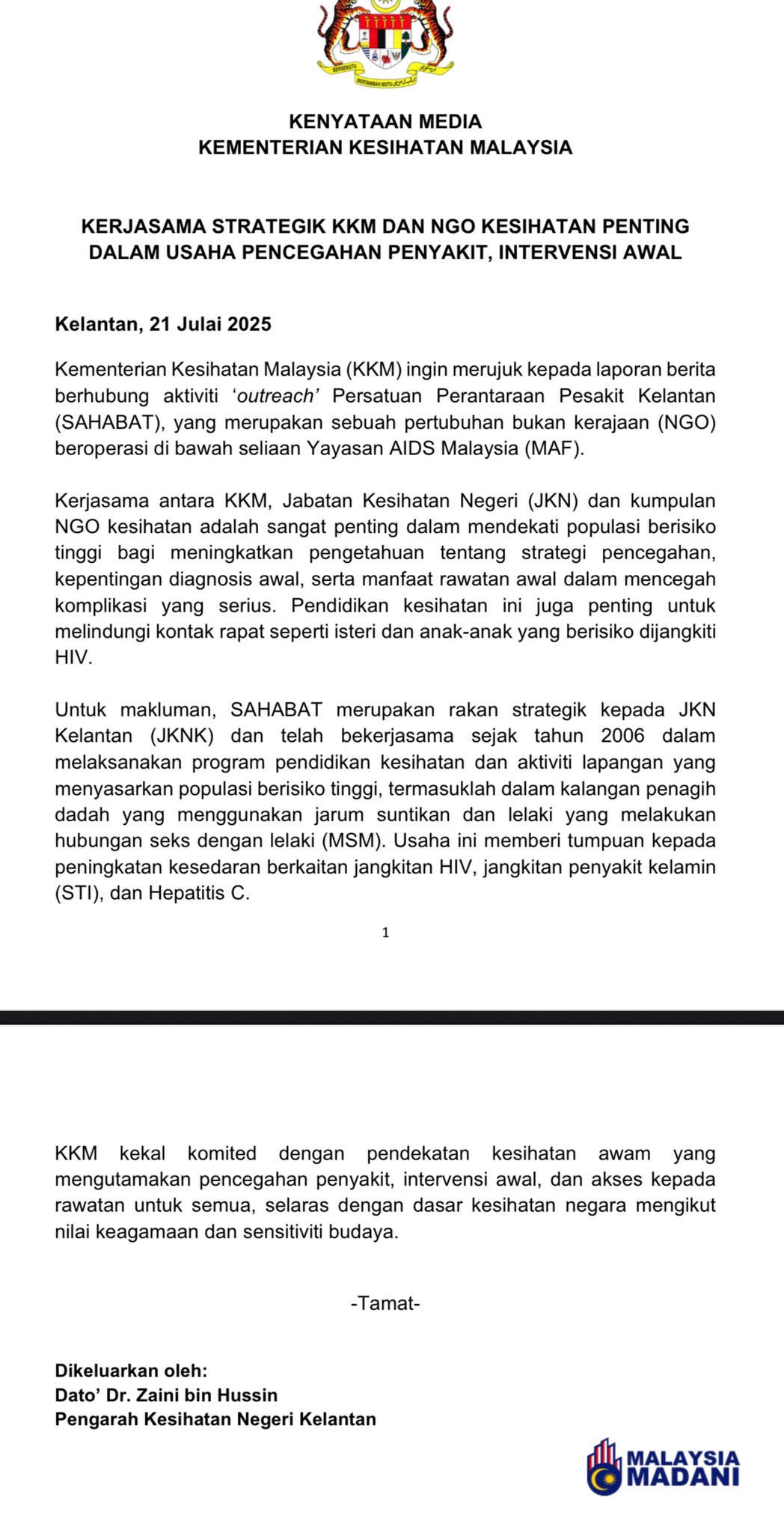 卫生部长基祖菲里阿末昨日在社交媒体上回应一则要求卫生部捍卫艾滋病防治外展工作的贴文,并附上吉兰丹州卫生局局长再尼胡辛(Zaini Hussin)于2025年7月21日发布的声明及其英文翻译。