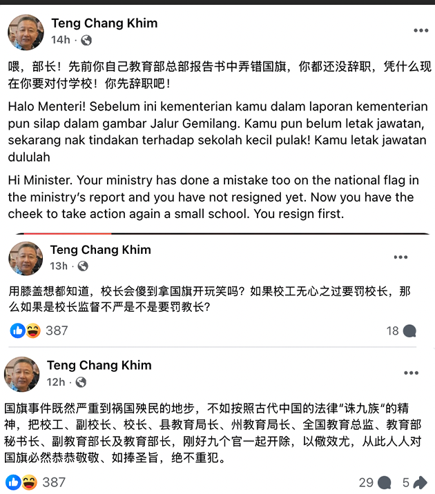 邓章钦也讽刺,若校工失误需罚校长,那是否部长也该因监督不周而下台?他还揶揄地建议,若当局要将责任层层追究,那不如比照古代“诛九族”的做法,把校工、副校长、校长、教育局官员,甚至副部长和部长一并撤职,“以儆效尤”。