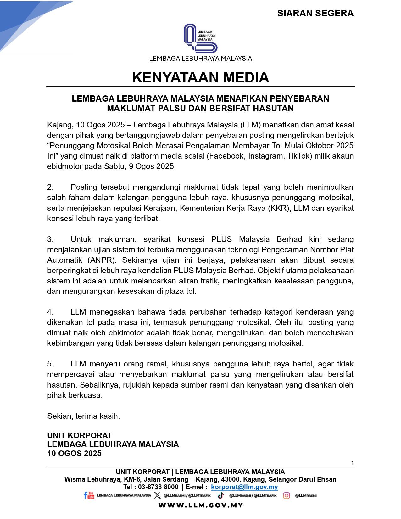 马来西亚大道局指出,摩哆依然豁免过路费,目前收费的车辆类别保持不变。