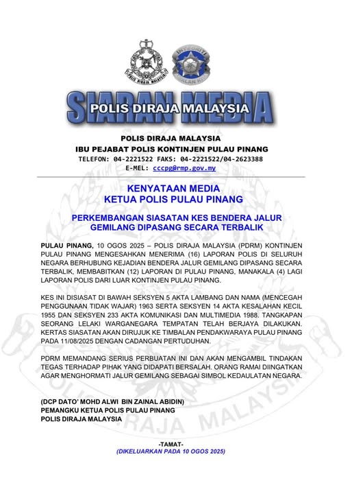 他说,截至目前,全国共接获16宗国旗倒挂投报,其中12宗来自槟州,其余4宗来自外州。警方援引1963年《徽章及名字(防范不当使用)法令》第5条文、1955年《轻微犯罪法令》第14条文,以及1988年《通讯及多媒体法令》第233条文(不当使用网络)展开调查。