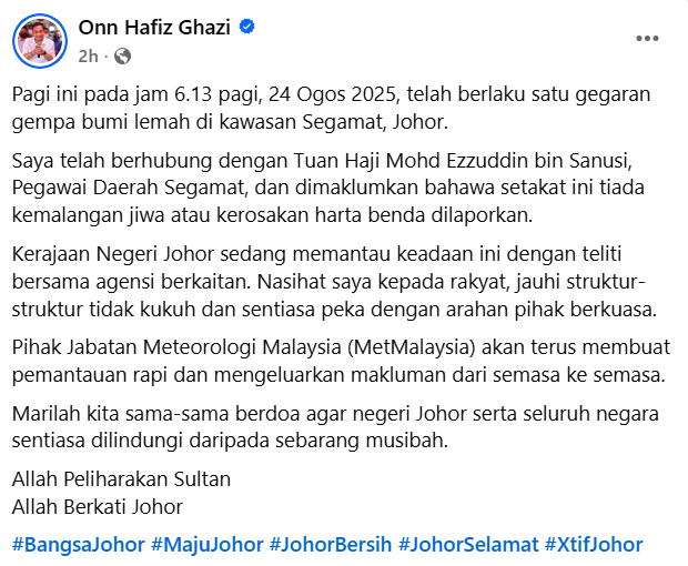 柔佛州务大臣翁哈菲兹也在脸书发文指,截至目前为止,没有传出人命伤亡或财物损毁报告。他呼吁民众保持警惕,远离不稳固的建筑,随时留意当局的指示。