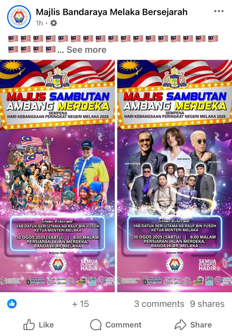 《中国报》报道,马六甲历史城市政厅在脸书发布国庆日倒数活动海报,却被网民一眼抓包,海报上“辉煌条纹”竟然出现16个角星星和11道红白条纹,国旗出错后,当局马上撤下帖子纠正,再重新上载新图。