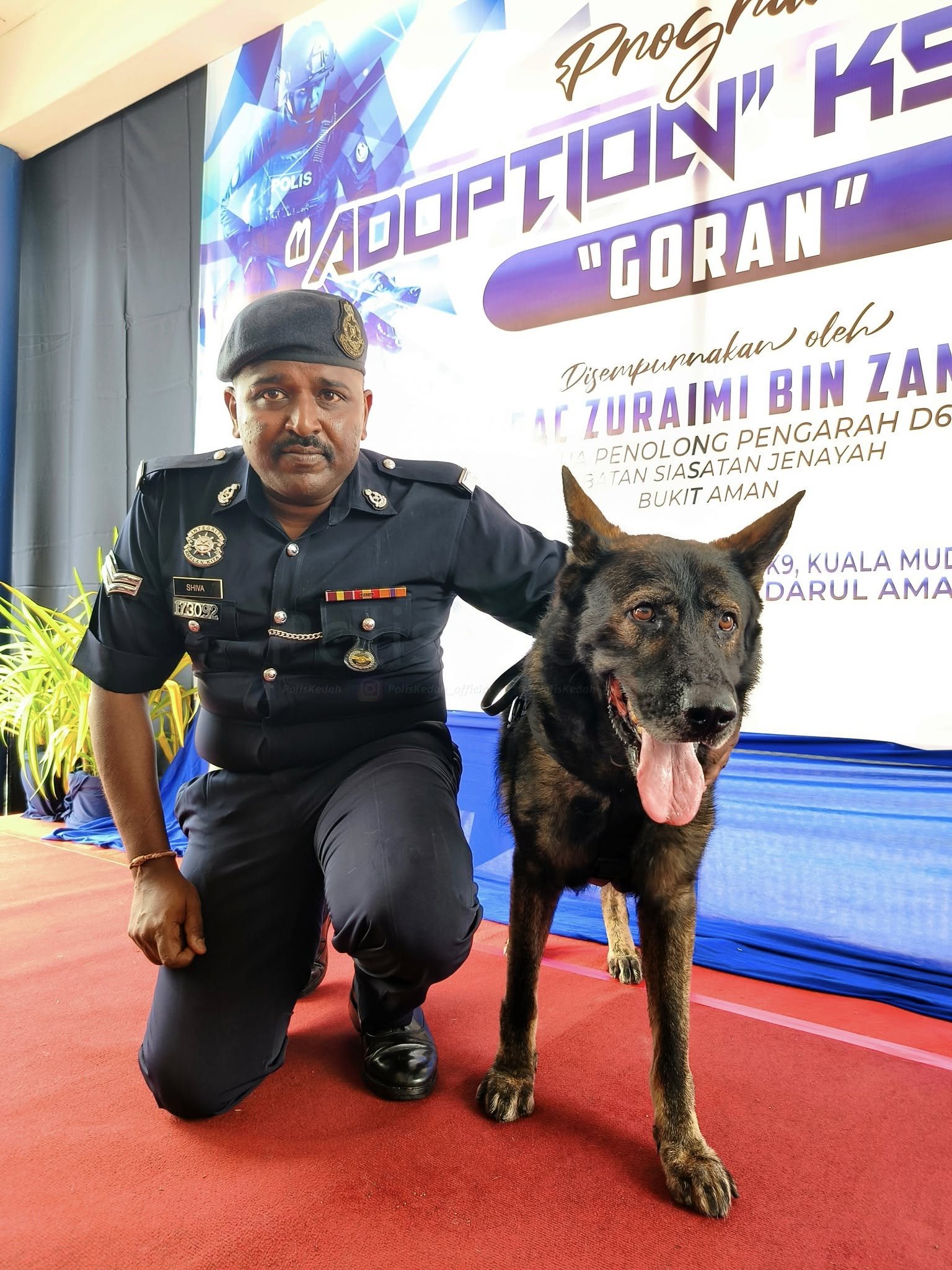 警犬组(K9)于1968年成立至今57年,首次落实领养计划,武吉阿曼刑事调查局(JSJ)是根据兽医的建议,决定启动这项领养计划。作为这项计划的首个试点,来自瓜拉姆拉警察总部的警犬Goran正式被领养,领养者是霹雳警察总部重案组(D9)的警长李胜威。
