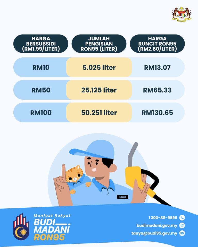 •若以10令吉添购RON95,可获得5.025公升汽油,并节省3令吉7仙。