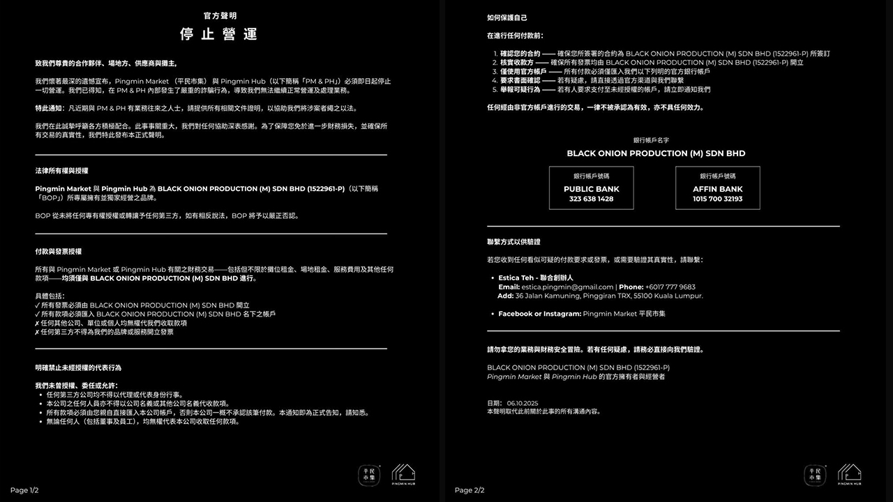 掀起文创与手作热潮的“平民市集”(Pingmin Market)与旗下“平民空间”(Pingmin Hub)惊传内部诈骗事件,主办单位今凌晨4时紧急宣布,即起全面停止营运。