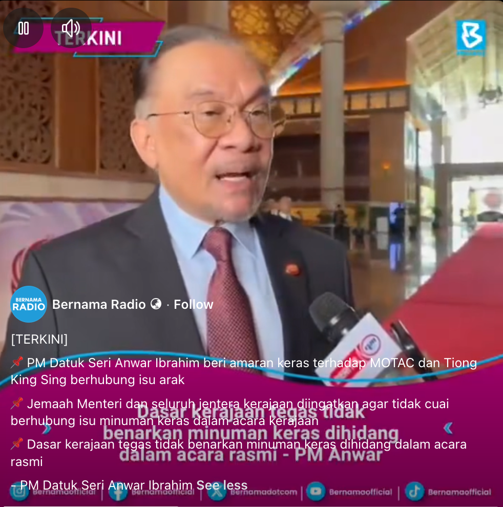 时事新闻 安华严厉提醒张庆信与旅游部 重申官方活动严禁供酒 07 Oct, 2025 首相安华今日严厉提醒旅游、艺术及文化部(MOTAC)及部长张庆信,要求各部门在公务活动中严格遵守政府政策,不得提供含酒精饮品。 据马新社报道,安华受访时强调,政府在此事上的立场坚定且明确——所有官方与公务活动一律禁止供应或饮用酒精饮品。 他提醒,全体内阁成员及各级政府机构应保持警觉,不可在此问题上掉以轻心。 “我已指示内阁及所有政府单位,不得在任何官方活动中提供含酒精饮品。这是政府一贯坚持的原则与立场。” (报导整理自《马新社》《光明日报》)