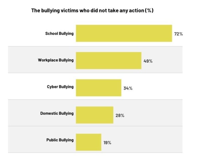 调查也发现,高达72%校园霸凌受害者未采取任何行动,职场霸凌(49%)、网络霸凌(34%)、家庭霸凌(28%)。