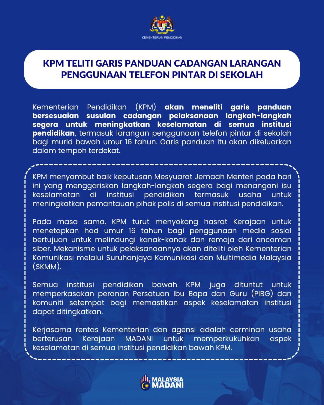 首相安华昨天宣布,内阁提出3项建议,以应对校园问题,当中包括:提高校园安全、禁止16岁以下学生使用智能手机及改善注重价值观和道德的教育内容。